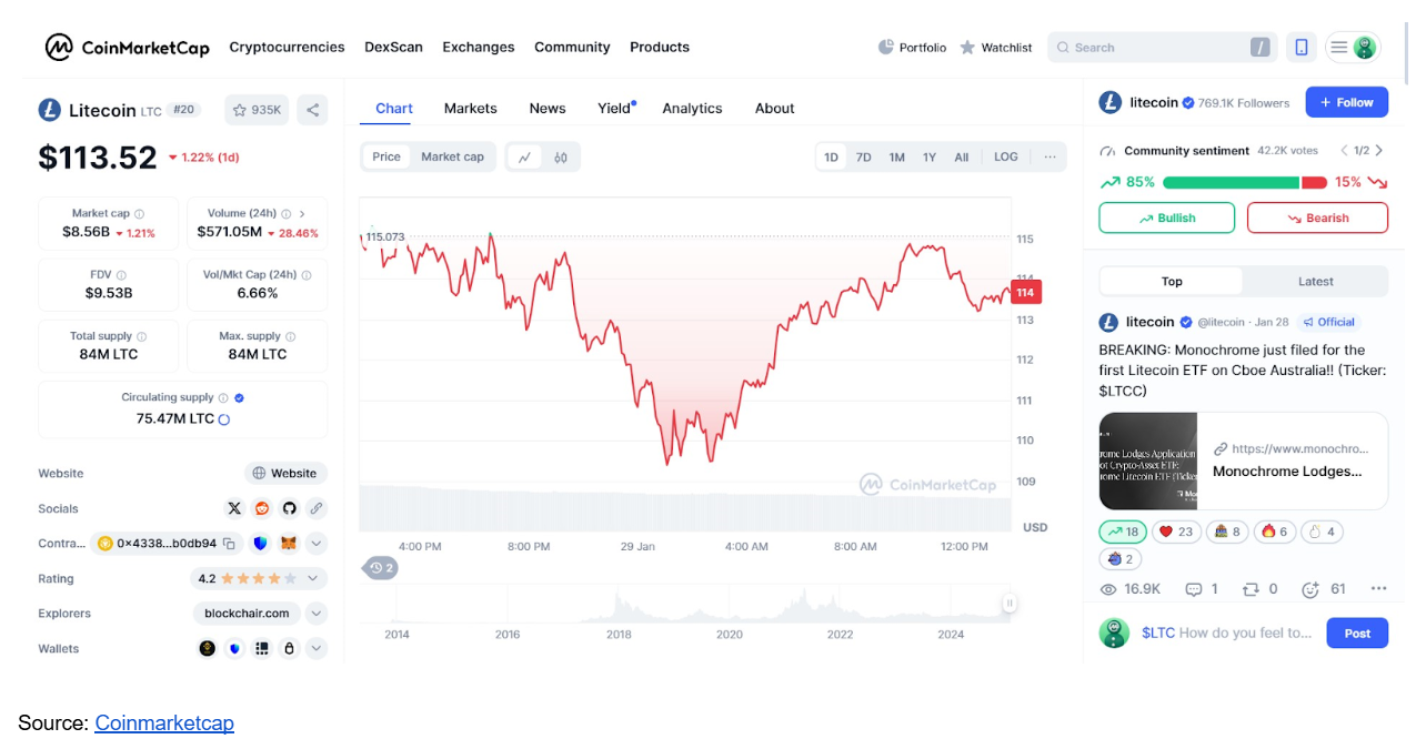 As of 28th January 2025, Litecoin (LTC) had a market capitalization of $8.6 billion making it the 20th largest cryptocurrency by market cap in the entire crypto market.